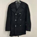 US Navy black pea coat. 100% wool. Size: 38R. Original enlisted soldier name tag still attached, as pictured.