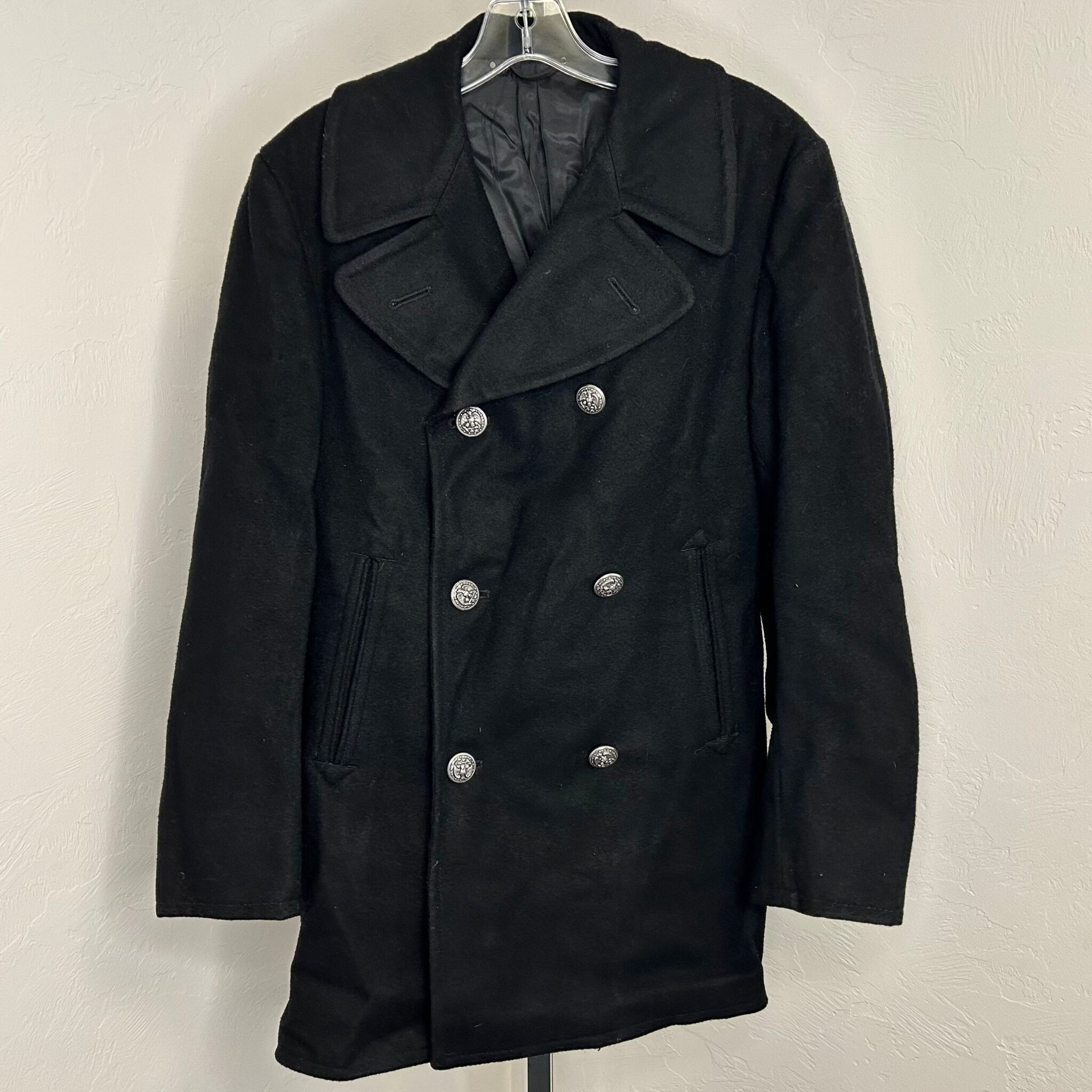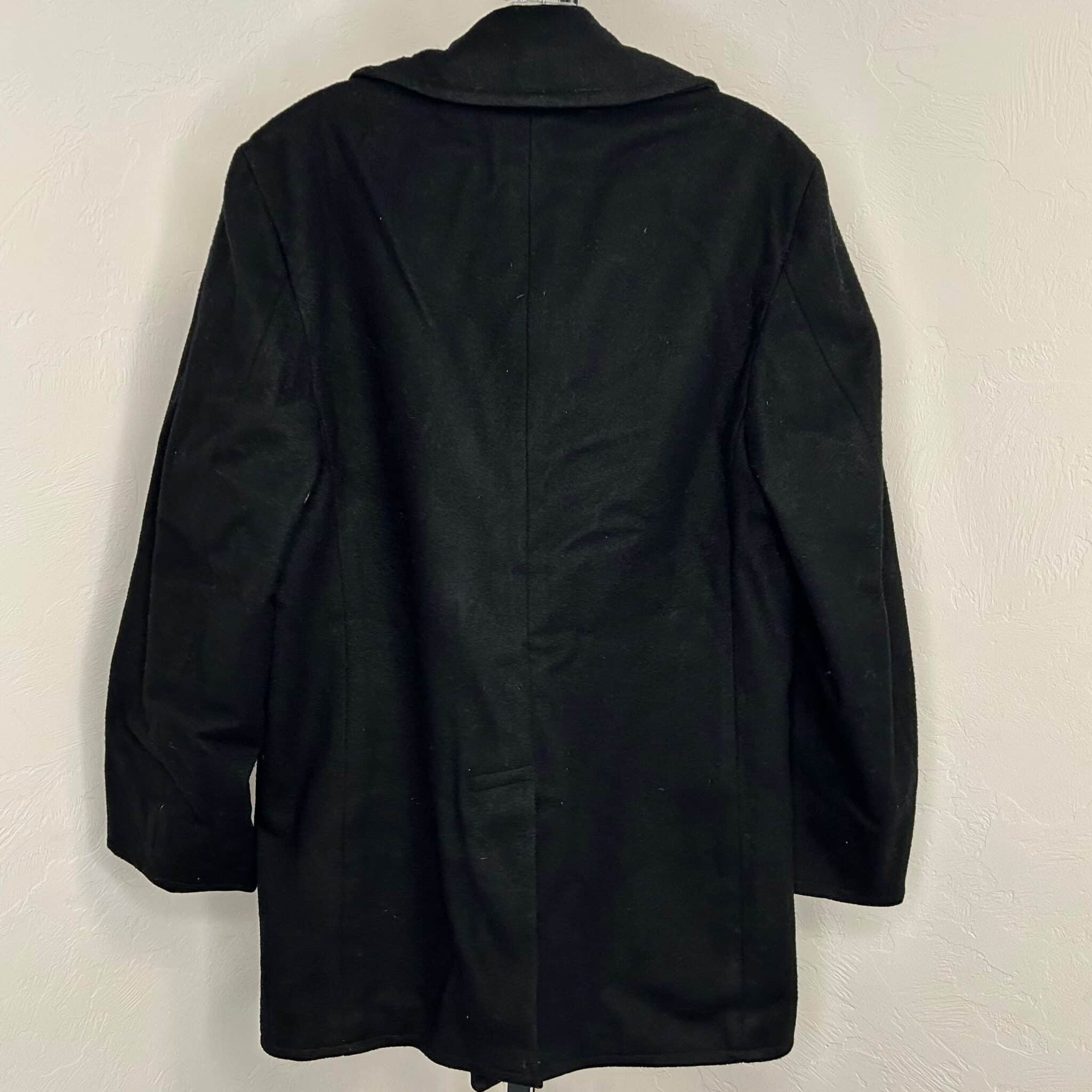 US Navy black pea coat. 100% wool. Size: 38R. Original enlisted soldier name tag still attached, as pictured.