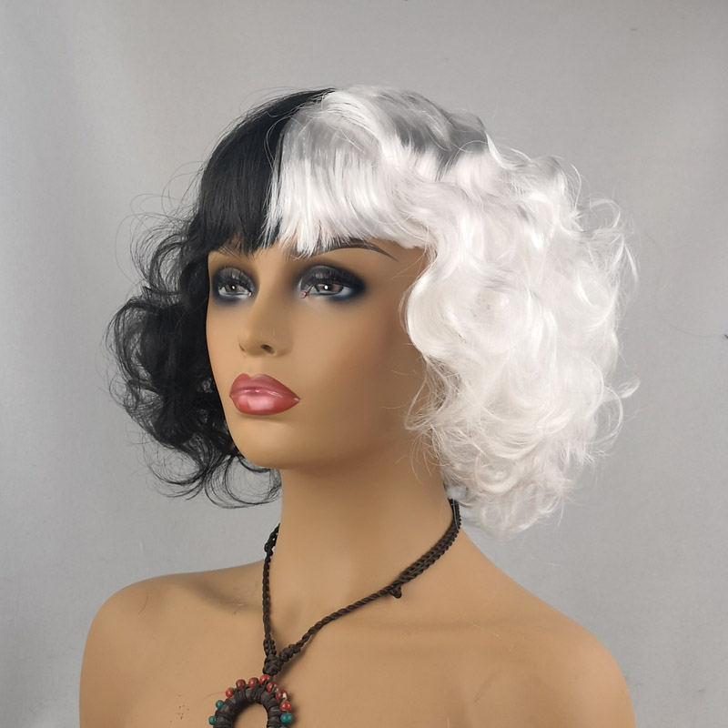 Glossy white and black spit dye wig with bangs, perfect for cosplays, costumes, or statement style.