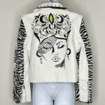 White leather jacket featuring elegant line art of a serene woman with her eyes closed, her flowing hair designed in artistic green and black oval patterns. The jacket includes black tiger designs on the removable sleeves along with spikes and tiger patterns. Finished with black detailing on the collar and pockets for a bold monochrome edge. 100% polyester