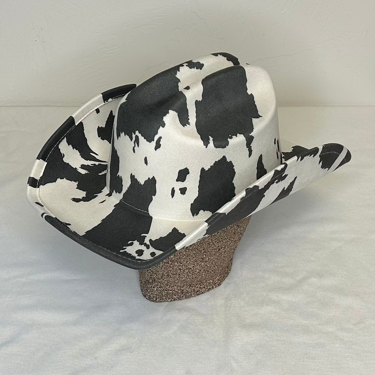 White with gray cow print faux suede cowboy hat. Reshapable brim.
