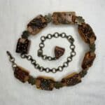 Wooden rectangles with three brass-color sphere rivets along top and bottom. Leather with brass-color four-leaf clover emblem in the middle of each leather strip. Adjustable chain and hook closure between 25″ and 43″ long.