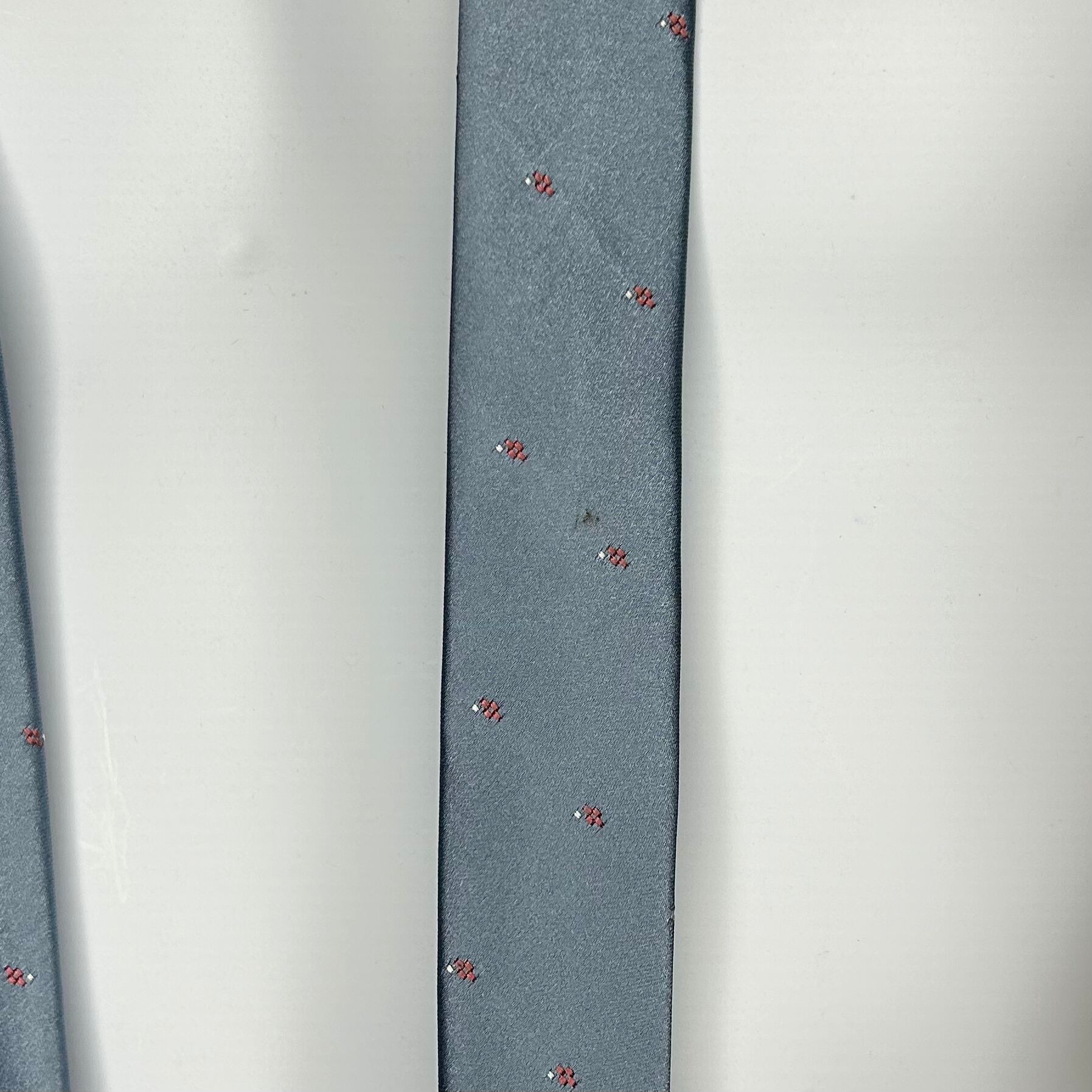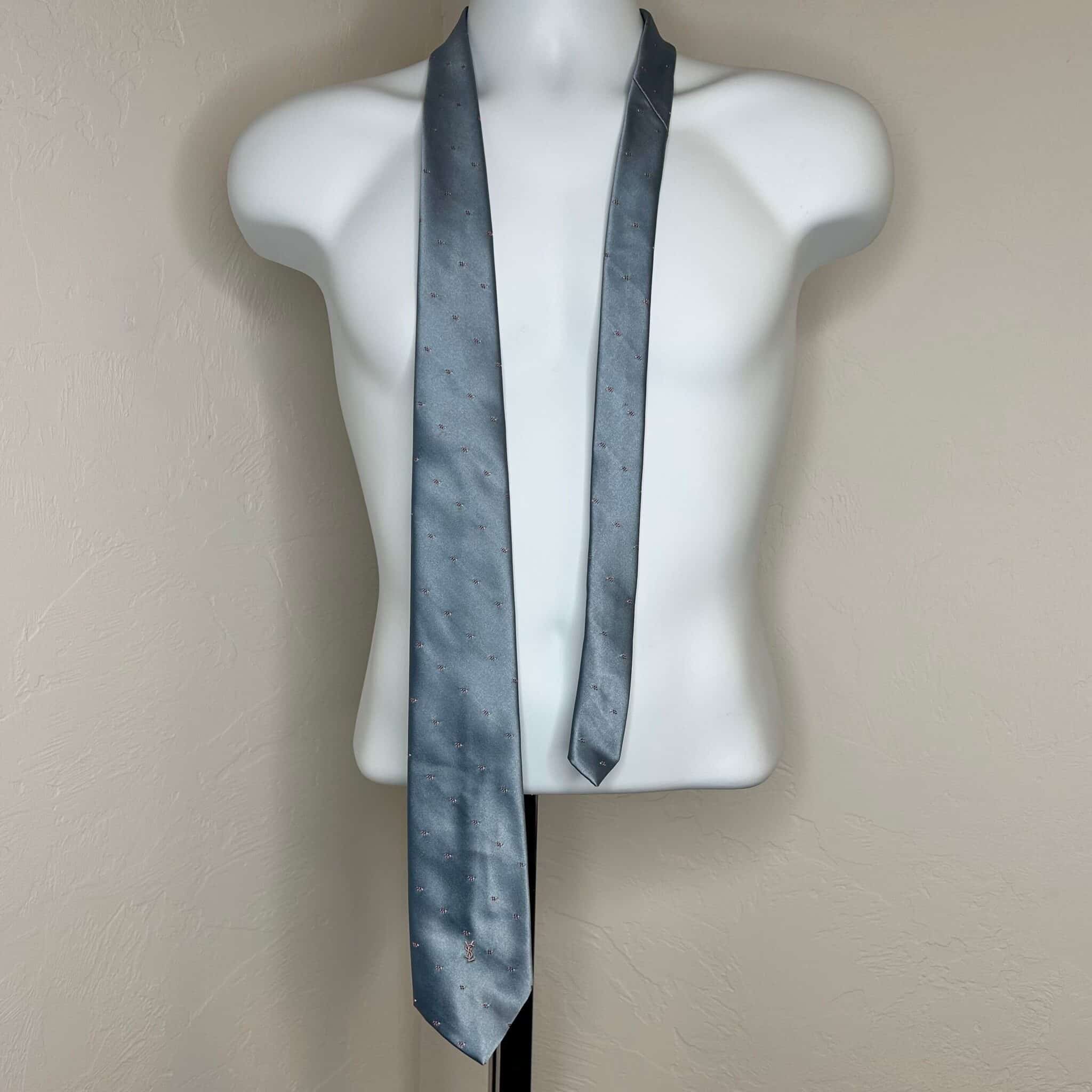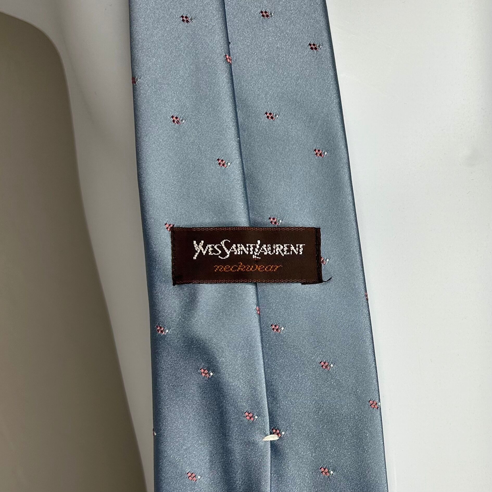 Yves Saint Laurent neckwear light blue embroidered tie. Small pink and white stitched pattern. Small stain on skinny end, as pictured.
